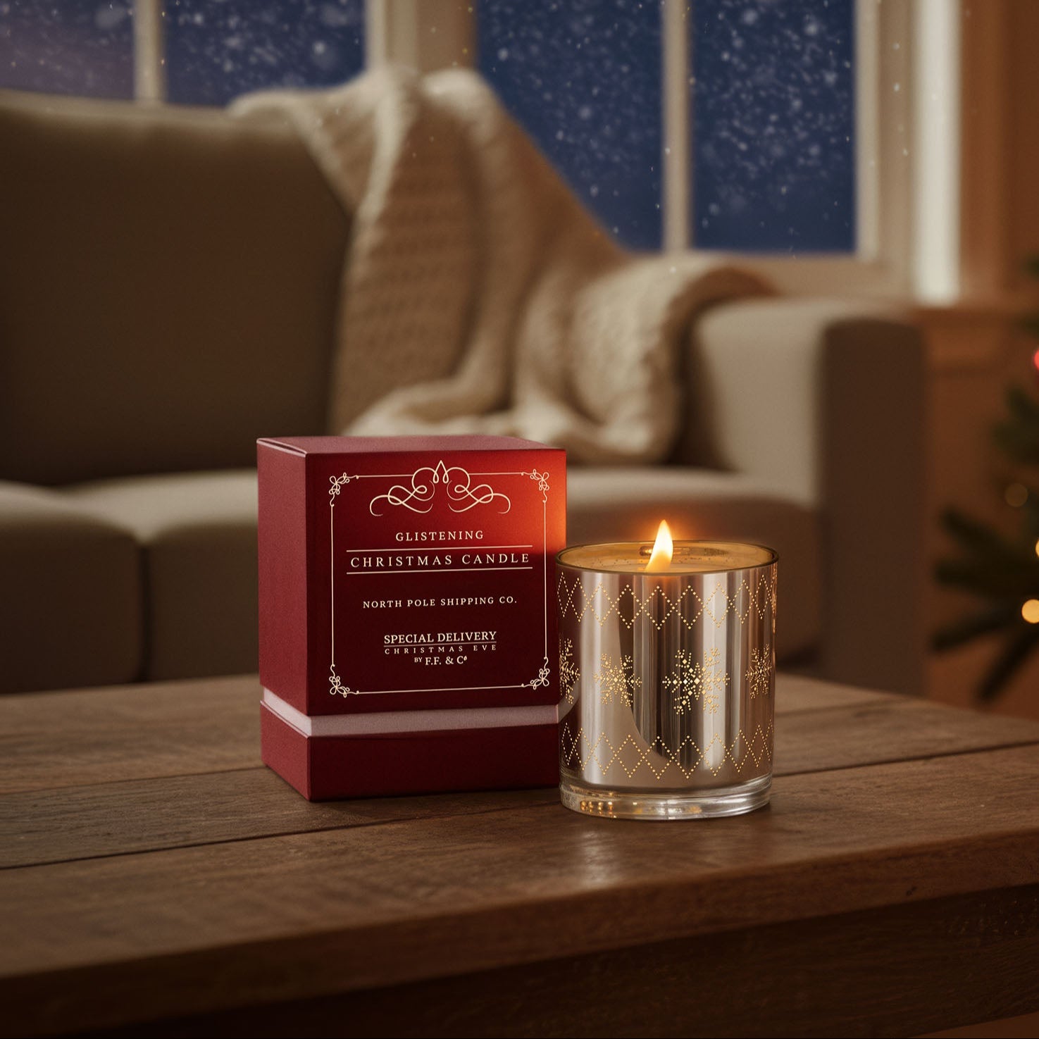 A hand-poured keepsake candle designed to be lit during the holiday season as part of your family tradition. Each candle comes in an elegant silver holder with a gold design, paired with a festive red gift box. When lit, the candle is a reminder of what matters most — shining your light on your loved ones.